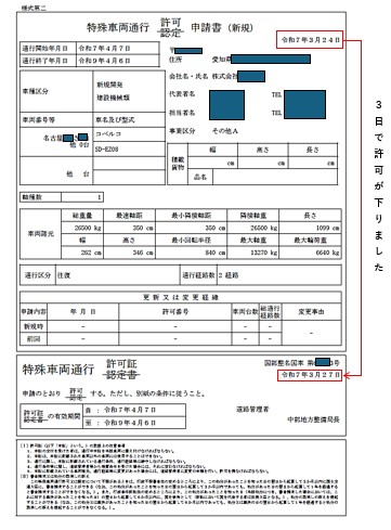 これは実際に弊所がお取りした特殊車両通行許可証です。右上は申請日です。